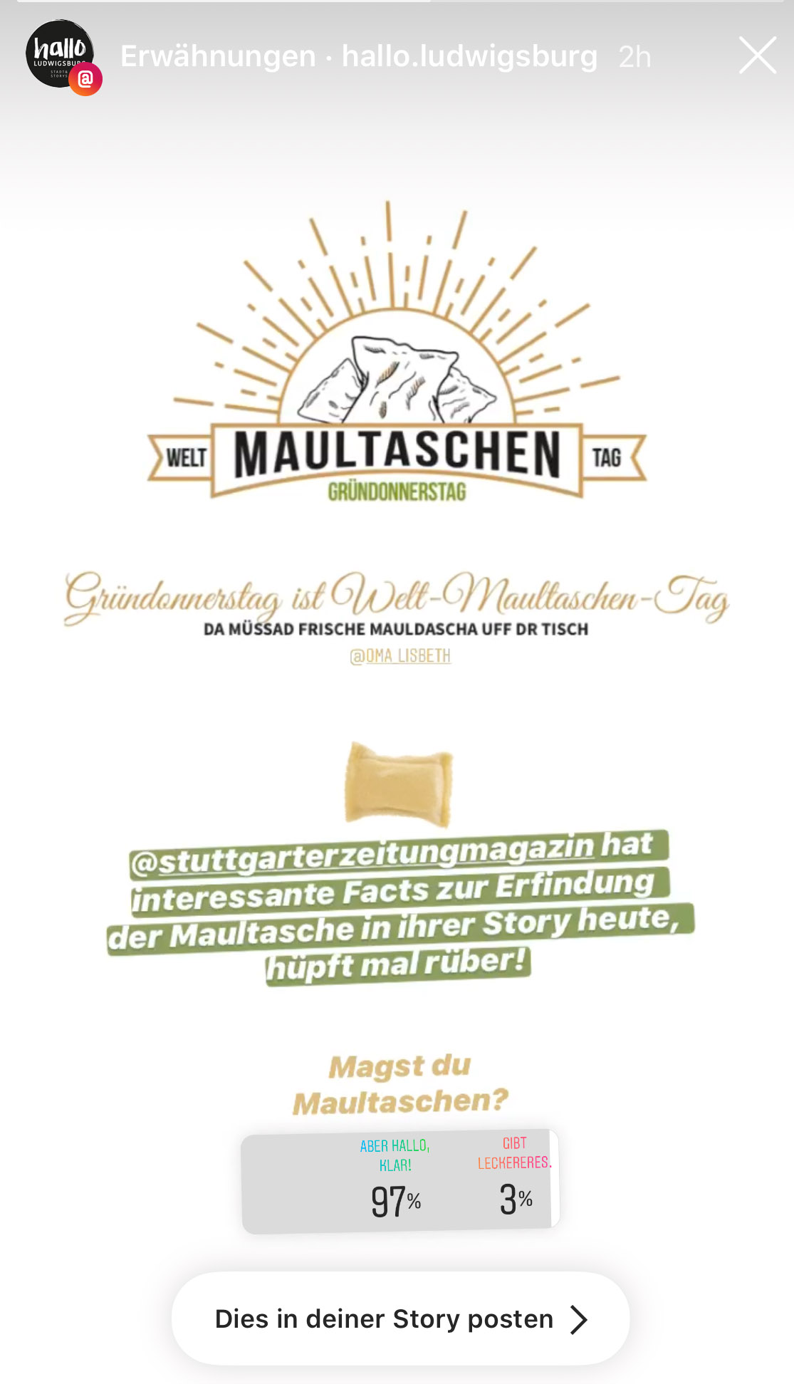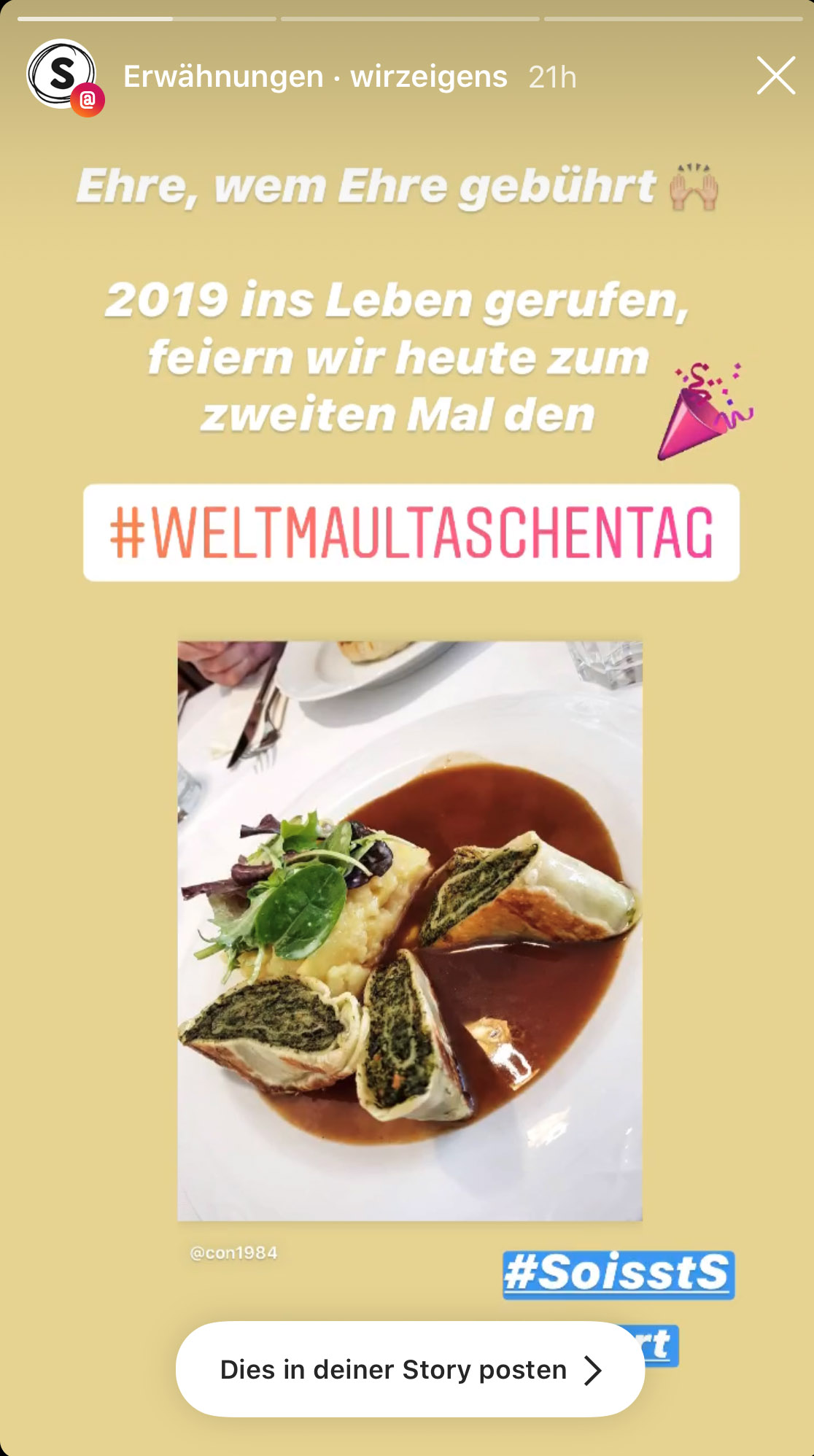 Erst 2019 ins Leben gerufen, gab es in diesem Jahr bereits erste Mitmacher und aktive Unterstützer! Das lässt unser Maultaschenherz höher springen. Toll zu sehen, wie viele Maultaschenliebhaber den Spaß mitmachen und ihre Liebe zu unserer allerliebsten schwäbischen Delikatesse teilen 🙂