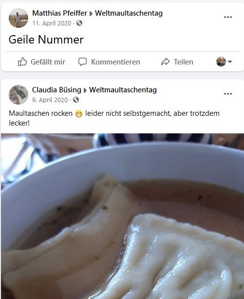 Auf Instagram (#weltmaultaschentag) sowie auf der neu gestarteten Facebookseite für den WeltMaultaschenTag haben sich Fans der Herrgottsbscheißerle zu Wort gemeldet und über ihre Aktionen und Maultaschengerichte berichtet.
