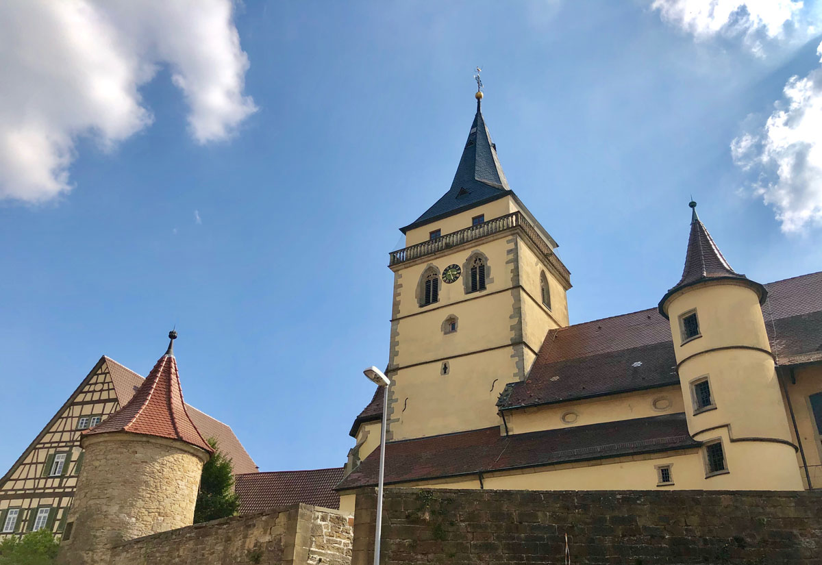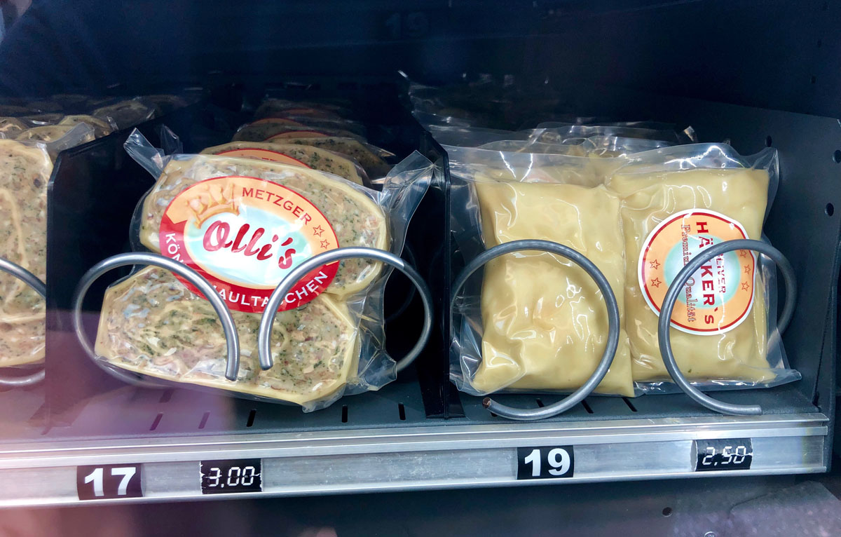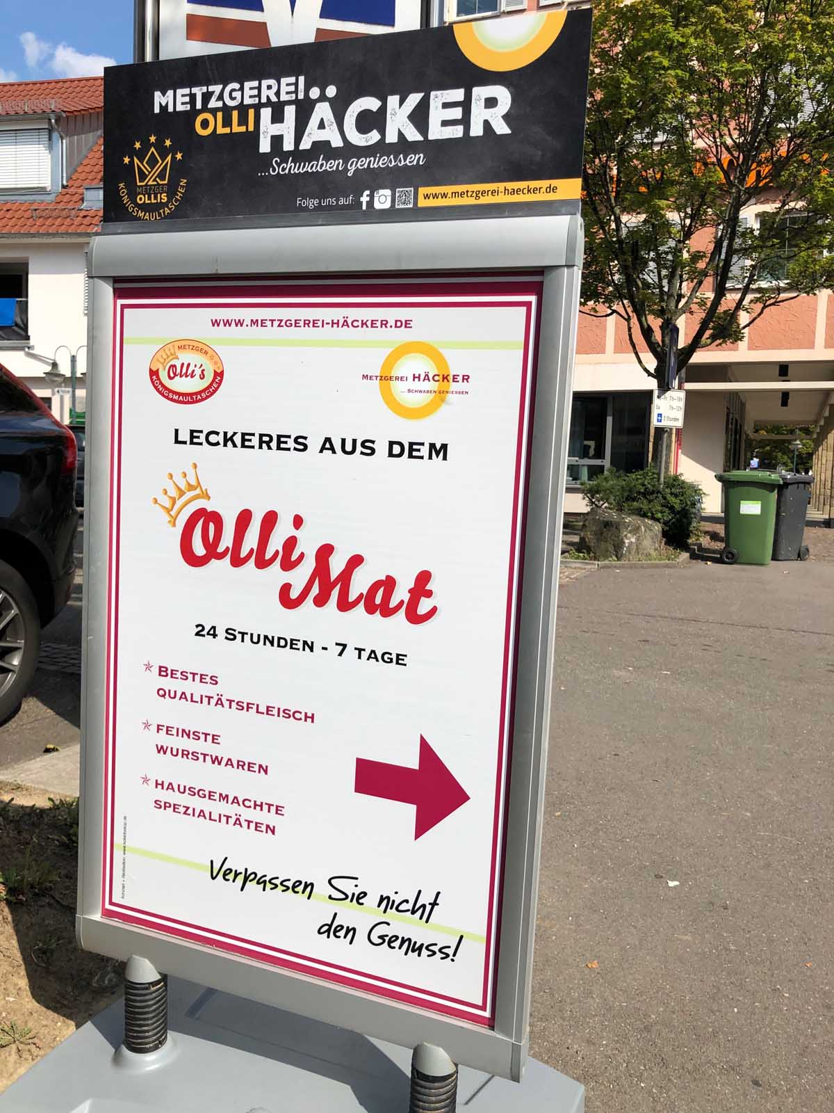 Die Metzgerei von Häcker hat schon geschlossen? Dennoch Lust auf gebratene Maultaschen? Kein Problem in Sachsenheim. Gegenüber der imposanten Evangelischen Stadtkirche Fabian und Sebastian, also inmitten des fast 1.000-jährigen Ortes, steht ein hochmoderner Automat für gekühlte Fleisch- und Wurstwaren des Diplom-Fleischsommeliers. Die Kunden können rund um die Uhr mit Bargeld oder per Kreditkarte die frischen Herrgottsbscheißerle ziehen!
