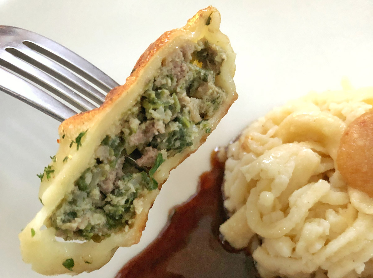 Seine Maultaschen sind richtige Maultaschen. Alles selbstgemacht, gewickelt, gekocht. Selbst der Teig kommt aus eigener Herstellung. Das Grundrezept für den Nudelteig stammt aus einem Kochbuch von 1904, dass er noch etwas verfeinert hat, wie er sagt. Man kann ihm in solchen Dingen vertrauen!