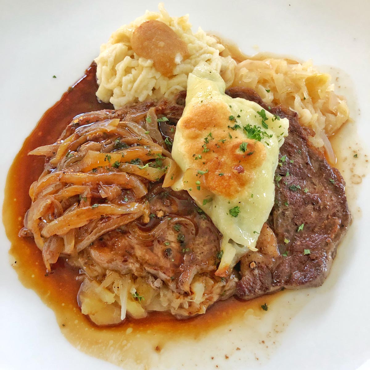 Die Familie Stöckl variiert das kulinarische Angebot am laufenden Band. Die großen schwäbischen Klassiker wie Schwäbischer Zwiebelrostbraten mit Mauldäschle, Saure Kutteln oder ein gebratenes Kalbsbries finden sich manchmal auf der Karte – aber nicht immer. Man braucht entweder Glück, oder sollte vorher anrufen.