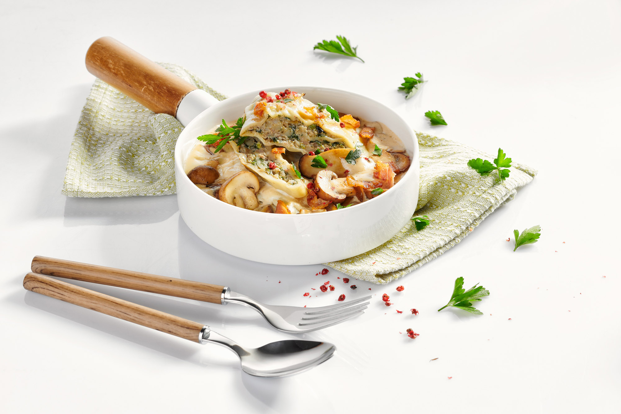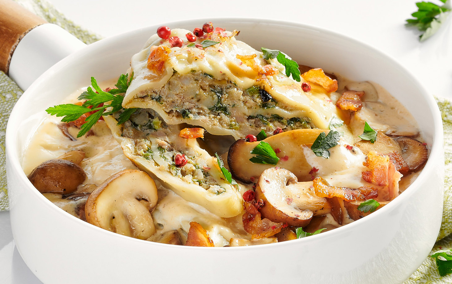 - Die heißen Maultaschen aus dem Topf nehmen, halbieren und auf der Pilzpfanne platzieren. Die Speckstreifen drüber verteilen. Mit rotem Pfeffer und frischer Petersilie garnieren. Guten Appetit!