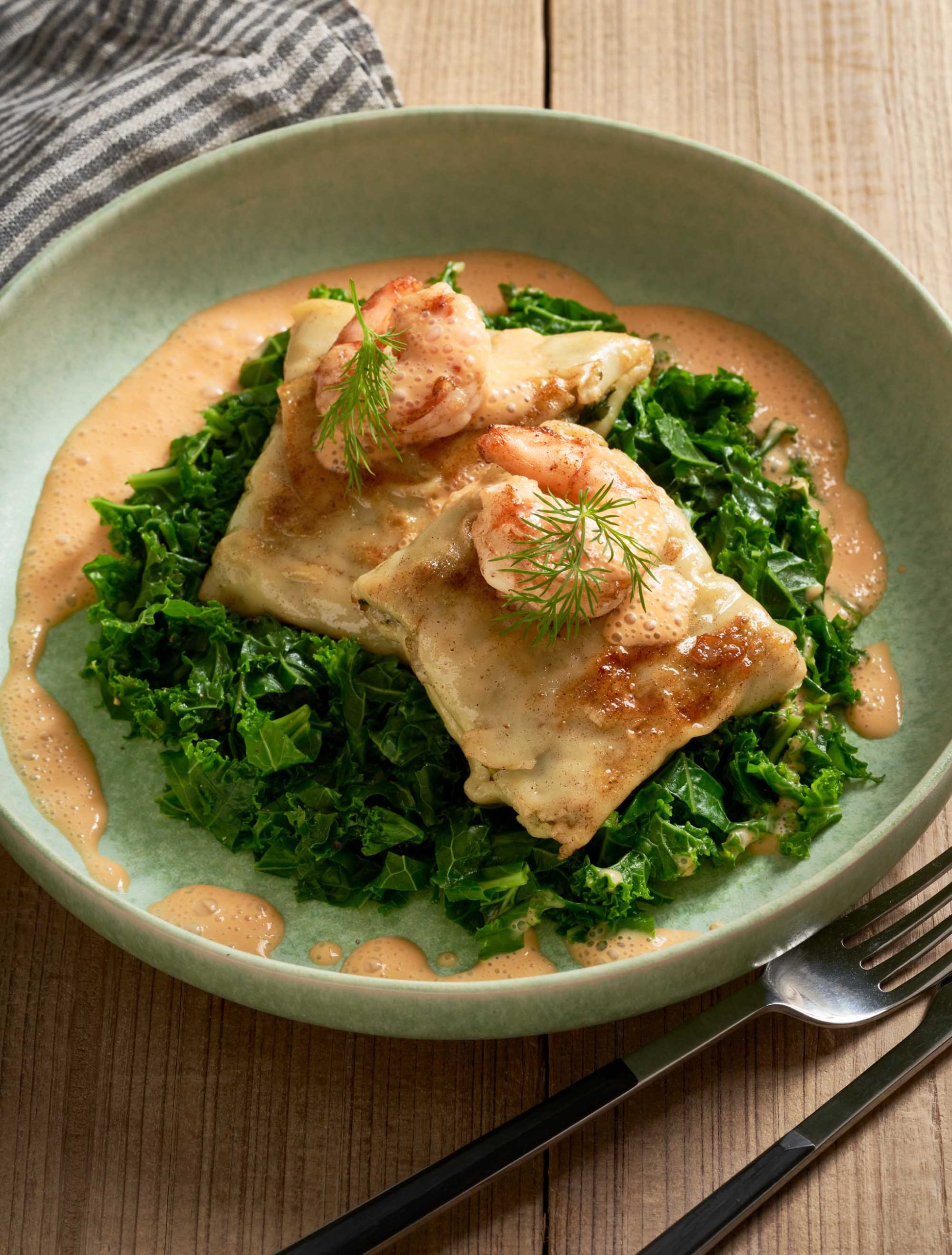 Diese amerikanische Grundidee lässt sich überaus geschmackvoll fusionieren mit Maultaschen, frischen Scampi und einer feinen Krabben-Schaum-Sauce. In den Wintermonaten eignet sich als Begleitung frischer Grünkohl.